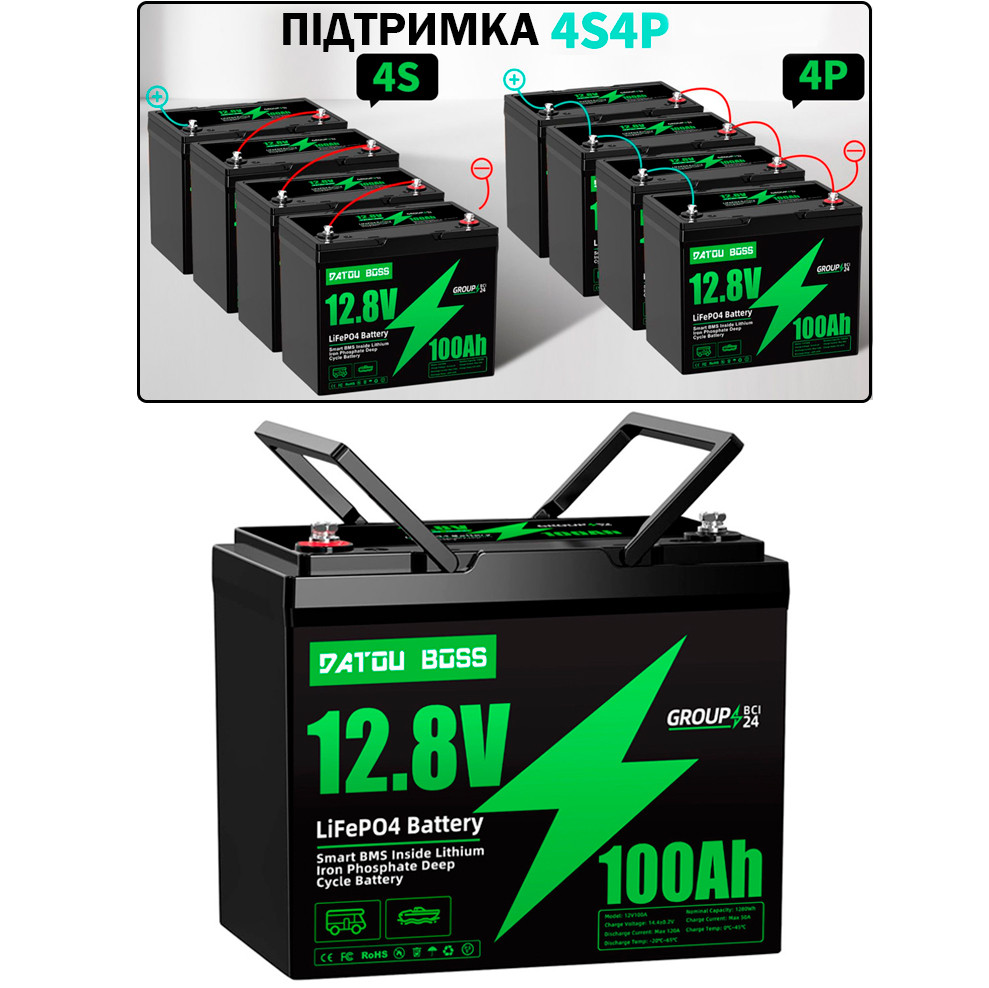 Акумулятор LiFePO4 DATOUBOSS 12.8V 100Ah з BMS, літій-залізо-фосфатна батарея для ДБЖ, RV, сонячних систем, струм розряду 100A