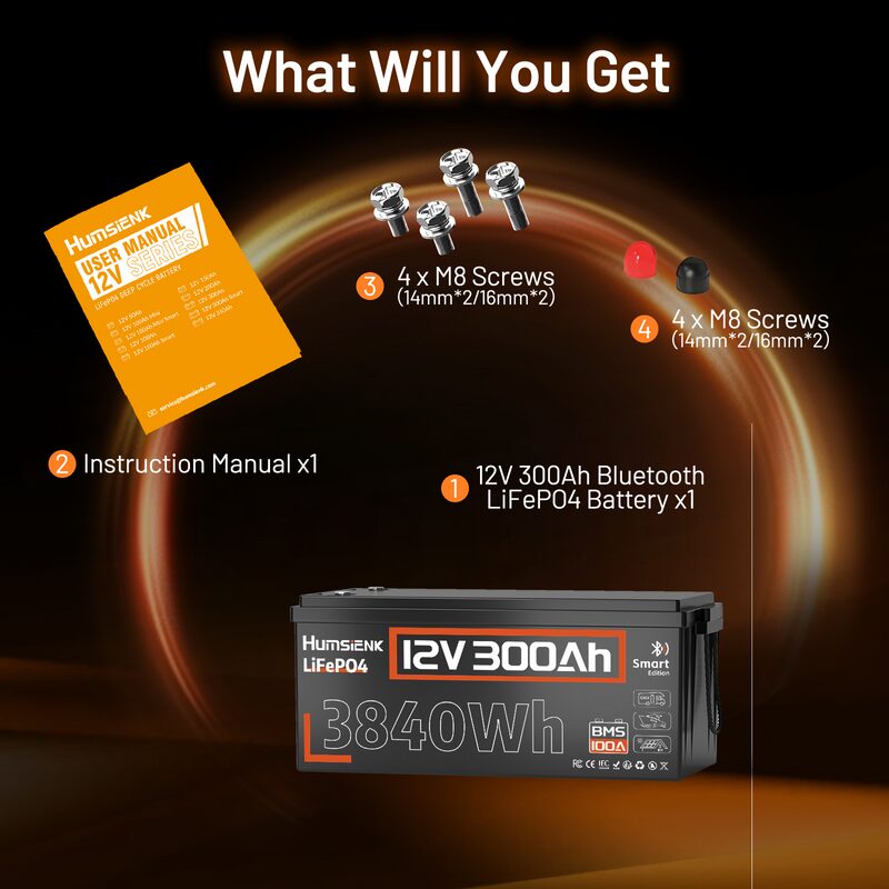 Акумулятор LiFePO4 12V 300Ah з Bluetooth – Humsienk | 3840Wh | 100A BMS | 15000 циклів | для фотоелектричних систем, кемпера, човна, автономних пристроїв