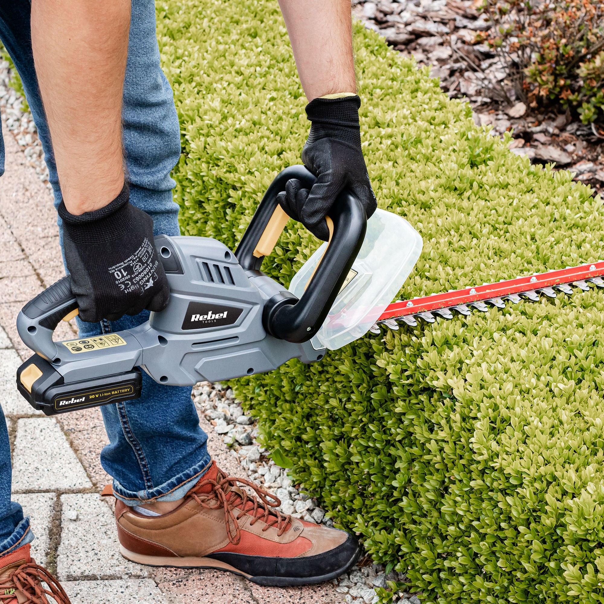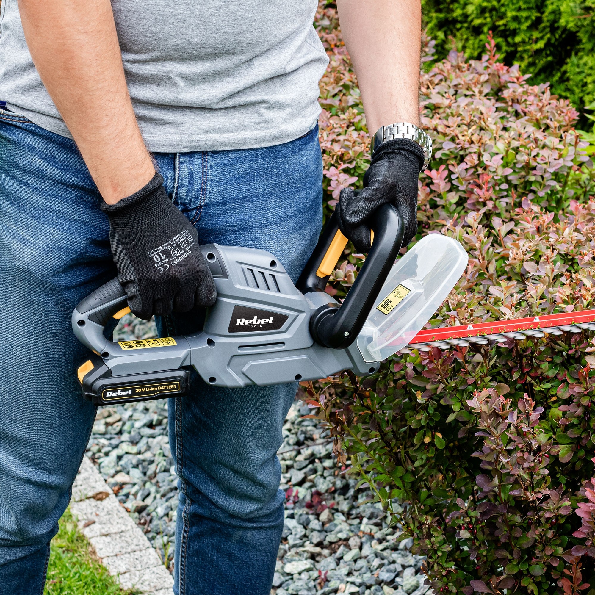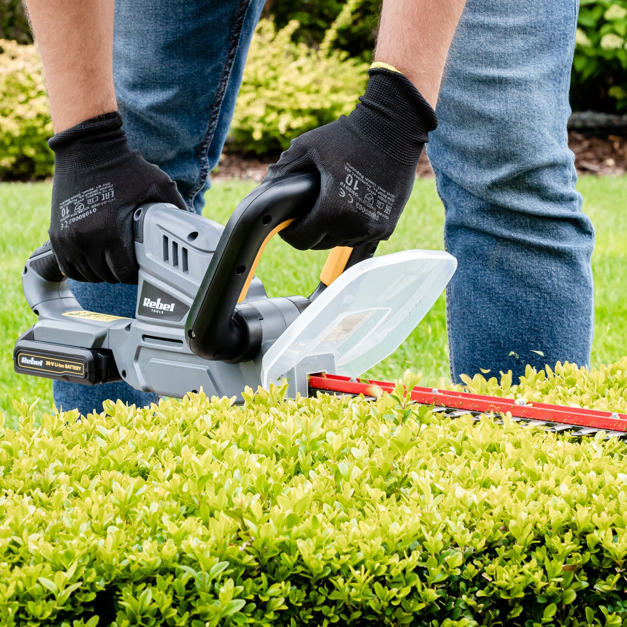 Якщо ви докладаєте багато зусиль для того, щоб кущі та живоплоти у вашому саду були гарно підстриженими, у нас є щось, що заощадить вам купу часу та зусиль! Замініть традиційні ручні тримери для живоплоту бездротовими тримерами серії Rebel Tools. Пристрій оснащений міцним сталевим лезом з лазерним різанням довжиною 520 мм , що дозволяє швидко, зручно та точно підстригати навіть широкі живоплоти. Для додаткової зручності та безпеки ножиці оснащені передньою ручкою та захисним кожухом .