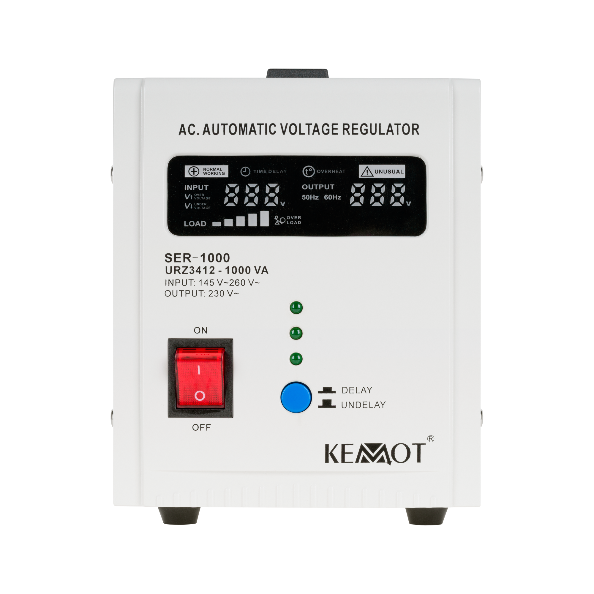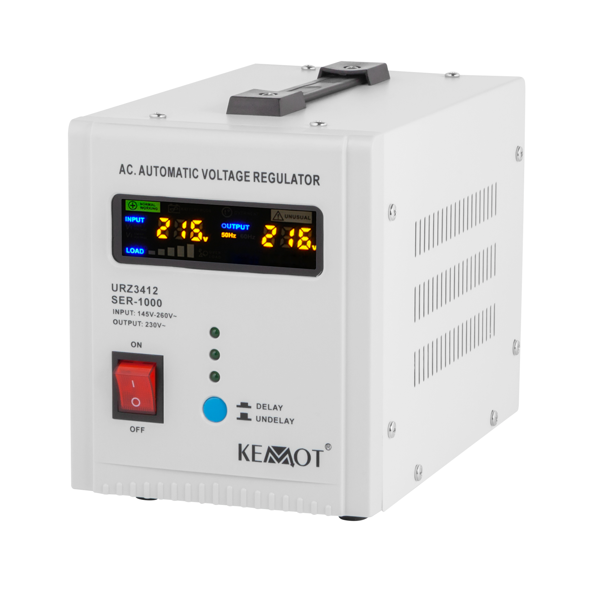 Якщо вам потрібен стабілізатор напруги для пристроїв з великим миттєвим пусковим струмом, вибирайте модель, оснащену функцією затримки включення DELAY. KEMOT SER-1000 оснащений кнопкою затримки перемикання DELAY від 6 до 180 секунд, що знизить ризик його поломки при високому миттєвому пусковому струмі підключених до нього пристроїв. Крім того, стабілізатор SER-1000 має захист від занадто високої і низької напруги, перевантаження, перегріву і короткого замикання.