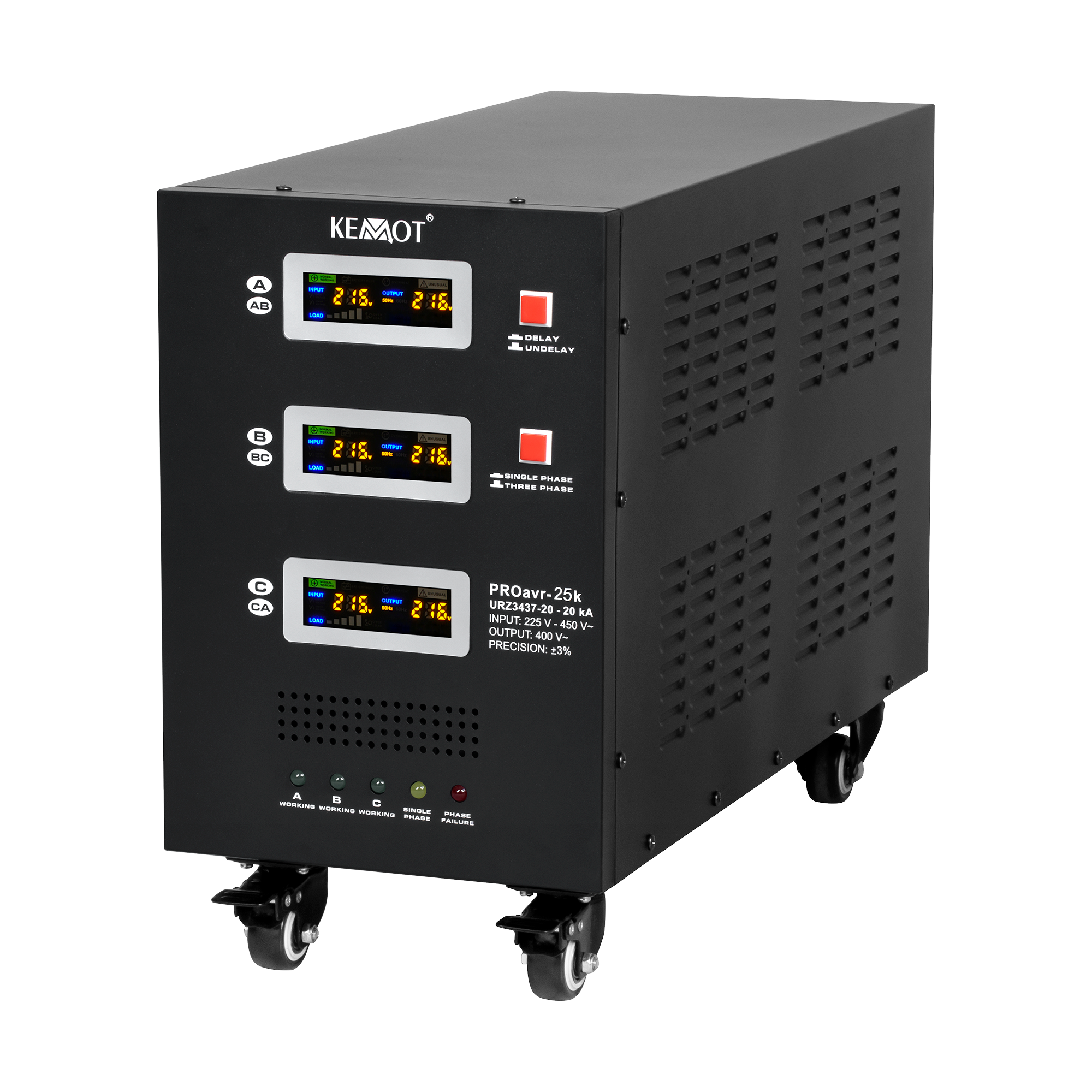Автоматичний трифазний стабілізатор напруги KEMOT PROavr-25k-призначений для стабілізації напруги в трифазних електромережах з метою забезпечення стабільного живлення та захисту обладнання від коливань, перенапруг, просідань і інших нестабільних станів у мережі.