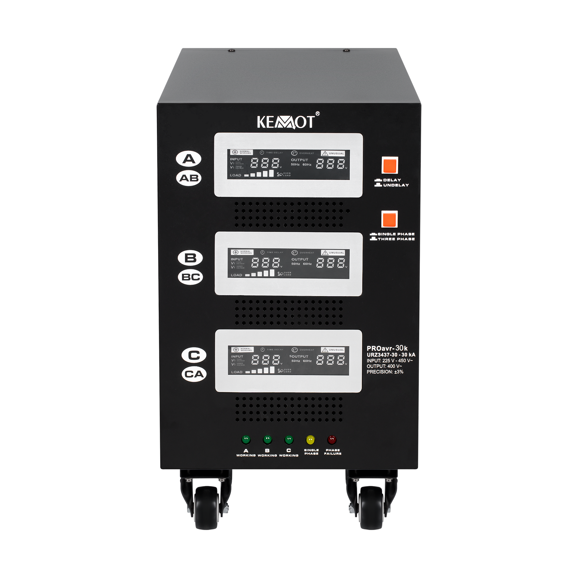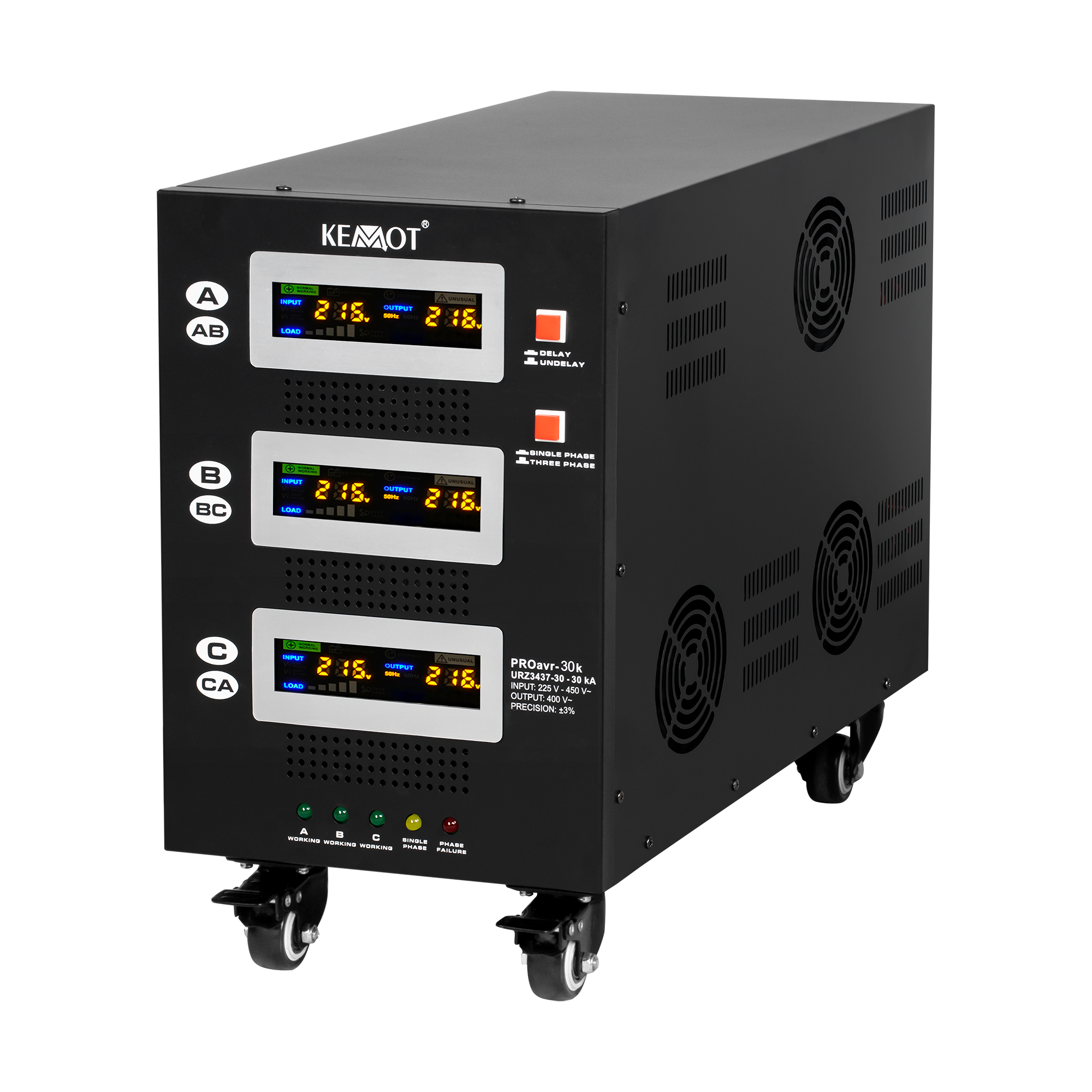 В однофазному режимі кожна фаза може працювати незалежно одна від одної. Незалежно від навантаження мережі та коливань вихідної напруги, стабілізатор KEMOT PROavr-30 підтримує їх на рівні 230 В ±3%, що дозволяє ефективно працювати всім пристроям, у тому числі чутливим до якості напруги мережі. Регулювання відбувається автоматично, що забезпечує високу точність вихідної напруги. Помилка в роботі однієї з фаз не впливає на роботу інших фаз.
