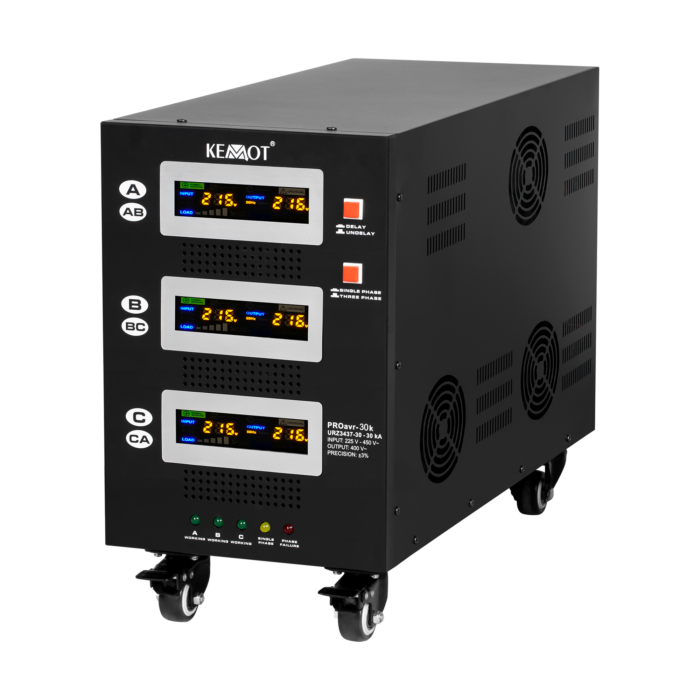 Автоматичний трифазний стабілізатор напруги KEMOT PROavr-30k-призначений для підтримки стабільної електричної напруги у трифазних мережах і захисту обладнання від небезпечних коливань, перенапруг, провалів і інших нестабільних станів у мережевому живленні.