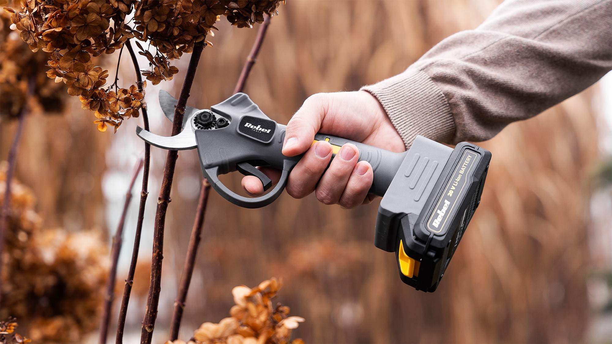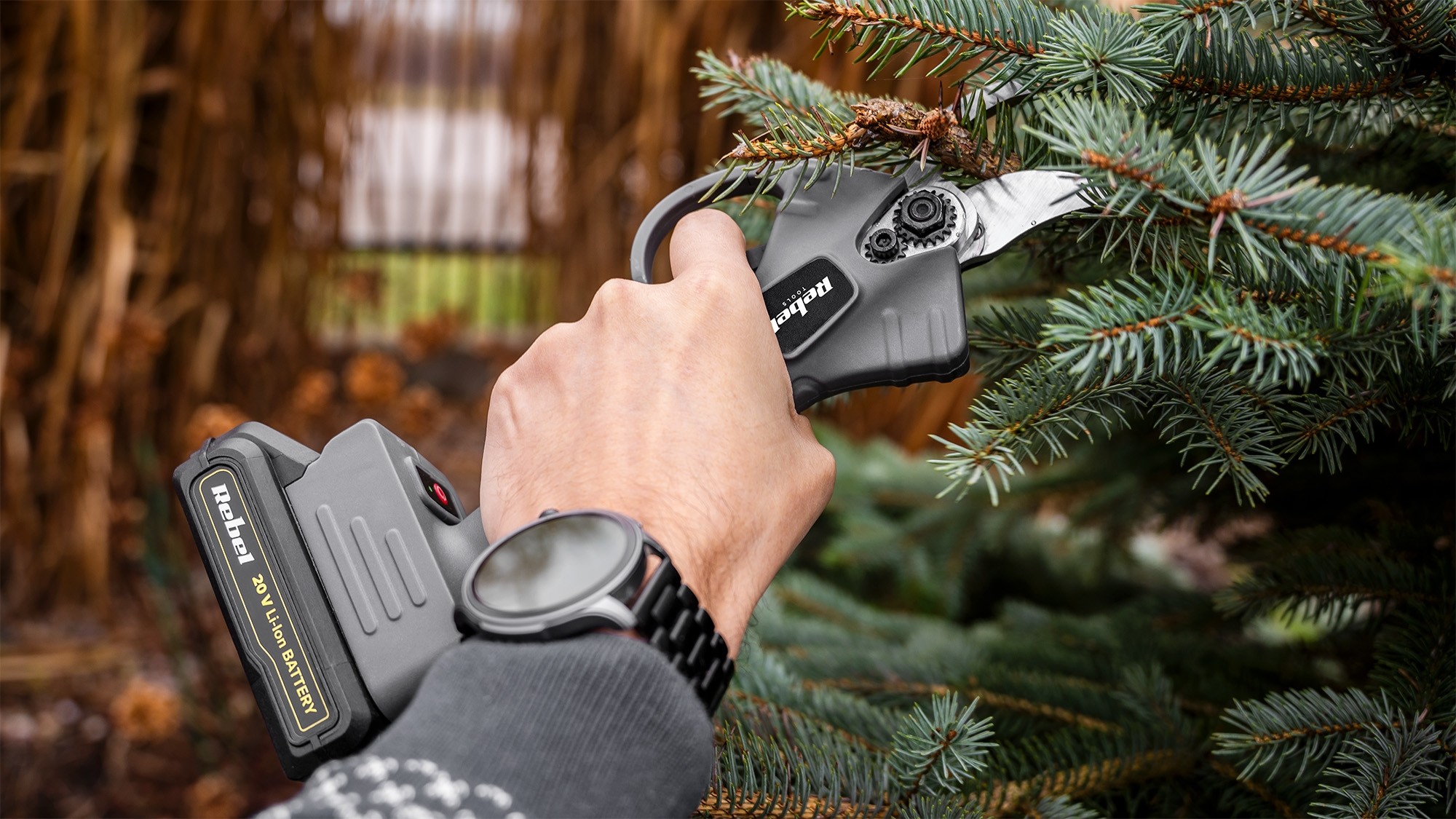 Бездротовий акумуляторний секатор REBEL RB-5006 працює від акумулятора, тому не обмежує рухів і дозволяє комфортно працювати навіть у важкодоступних місцях.