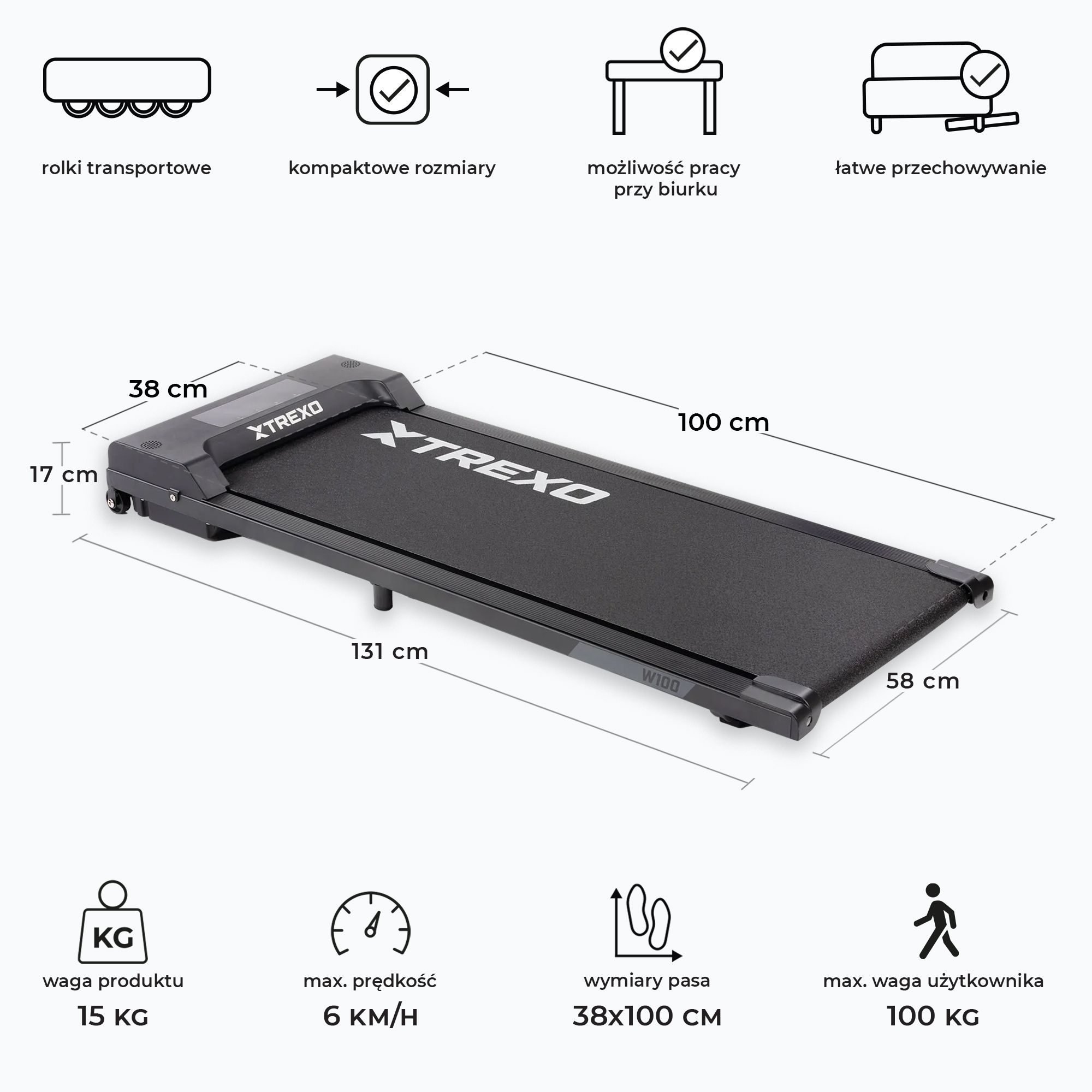 Підкладка для ходьби XTREXO W100 – це компактна модель, ідеальна для дому та офісу. Її невеликий розмір та зручність зберігання роблять її ідеальною для невеликих приміщень. Після тренування бігову доріжку можна легко зберігати під ліжком або в шафі, що дозволяє оптимально використовувати доступний простір.