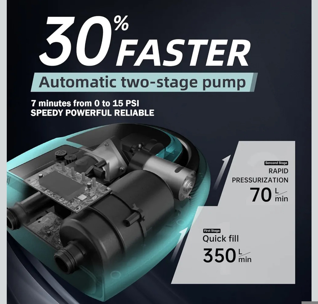 • Інтелектуальний подвійний двигун: Перший двигун 350 л/хв швидко накачує до 1,5 PSI та автоматично перемикається на другий двигун 70 л/хв. Потужний двигун надуває вашу дошку для серфінгу до 15 PSI за 7 хвилин. Програма захисту від перегріву автоматично вимикає живлення, якщо насос перегрівається, запобігаючи пошкодженням та продовжуючи термін його служби.