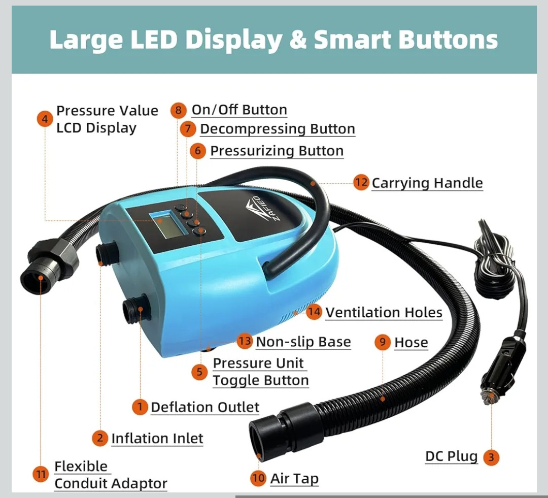 Електричний насос для SUP-дошки ZAFIED LUBAKED 20PSI 12V LCD 3251 Завдяки портативному формату насос зручно брати із собою на пляж, у подорожі або на відпочинок біля води. Пристрій підходить не лише для SUP-дошок, а й для інших надувних виробів, таких як човни, матраци чи каяки.