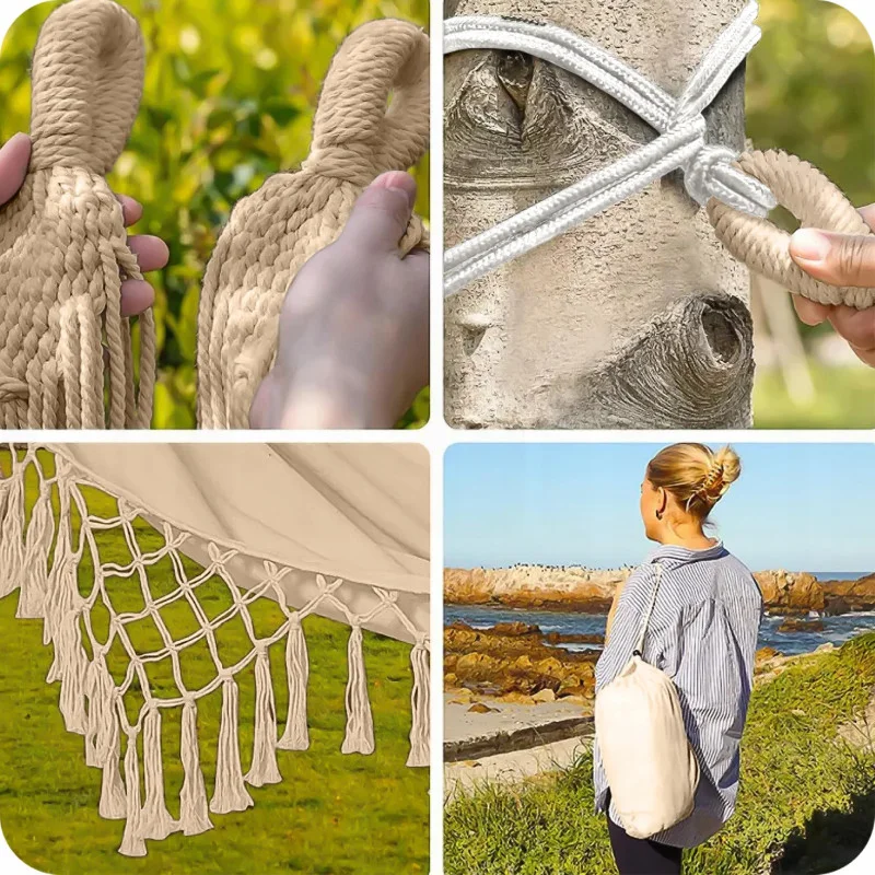 - Міцні, багатоплетені мотузки з міцними ручками роблять встановлення гамака швидким та інтуїтивно зрозумілим.