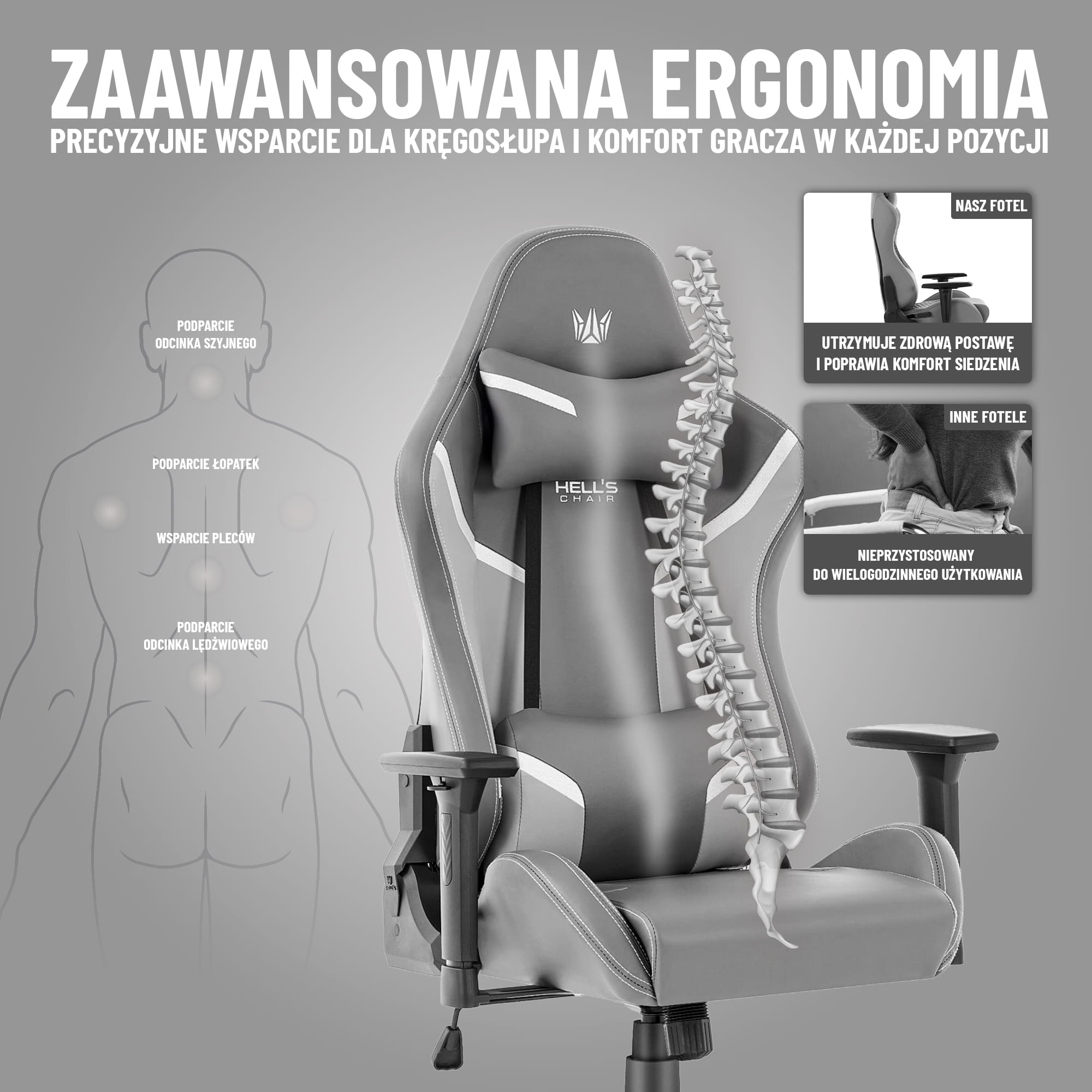 Геймерське крісло Hell’s Chair HC-2002 Grey White Модель створена для зручного проведення часу за комп’ютером — під час ігор, роботи або навчання. Продумана форма спинки та м’які елементи допомагають підтримувати комфортне положення тіла навіть під час тривалого сидіння