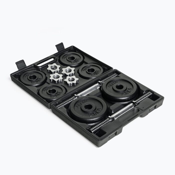 Весь набір, що складається з пластин, двох грифів для гантелей і затискачів, упакований в зручний кейс, що дозволяє легко зберігати і транспортувати набір. Ви можете займатися де завгодно.