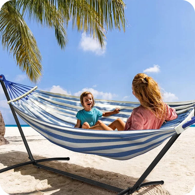 Наш гамак з каркасом ідеально підходить для саду, патіо або кемпінгу. Ви також можете використовувати його в приміщенні, якщо у вас достатньо велика кімната.
