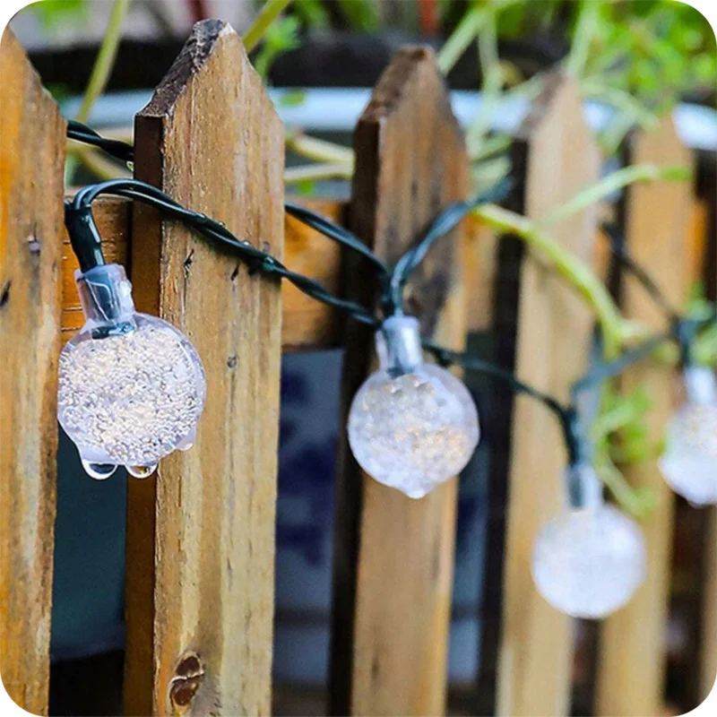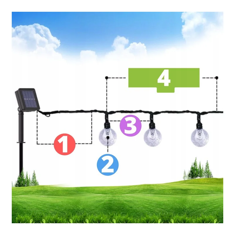 - Комплект із 50 світлодіодних ліхтариків (кульок) на 7-метровому кабелі з сонячною панеллю та монтажним шипом.