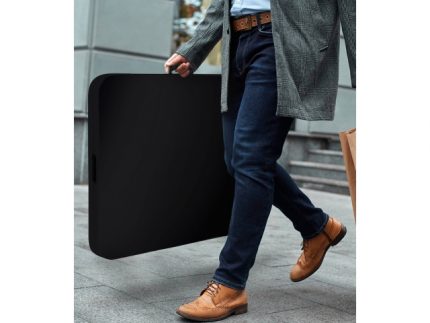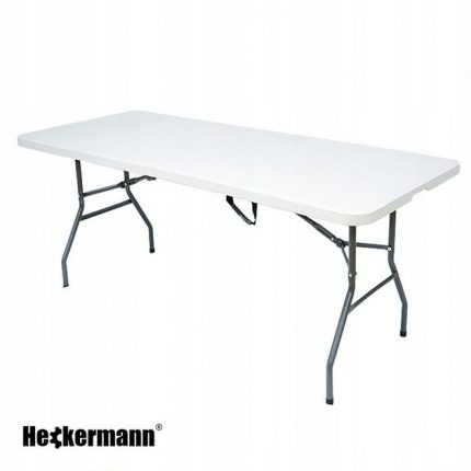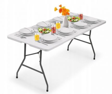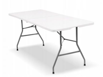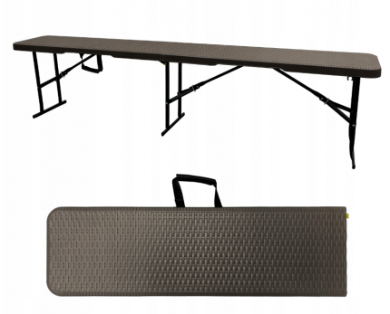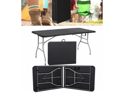 Чорний розкладний стіл 180 х 70 х 74 см великий і стійкий. Його верх виготовлений з міцного пластику , що полегшує догляд. Ніжки, що складаються під стільницю, виготовлені зі сталі і захищені від згинання під вагою їжі та напоїв . Коли ви ним не користуєтеся або хочете його транспортувати, він перетворюється на стіл-валізу. У цьому продуманому дизайні ноги моделі заховані всередині.
