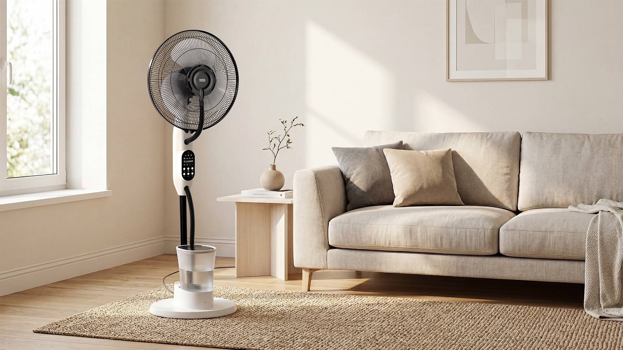 Охолодження з додатковим освіжаючим ефектом? Так! Вентилятор Teesa має функцію розпилення, яка дбайливо зволожує повітря, забезпечуючи полегшення у найспекотніші дні. Три рівні інтенсивності розпилення та резервуар об’ємом 2,8 літра забезпечують до 8 годин роботи без необхідності доливання.